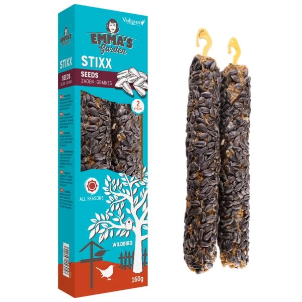 De Emma’s Garden STIXX zijn een heerlijke versnapering voor wilde vogels in elk seizoen. Zonnebloempitten zijn rond een stick gebakken tot een overheerlijke snack. De vogels kunnen al hangend de zaden van de stokjes pikken, ze pellen en lekker oppeuzelen.