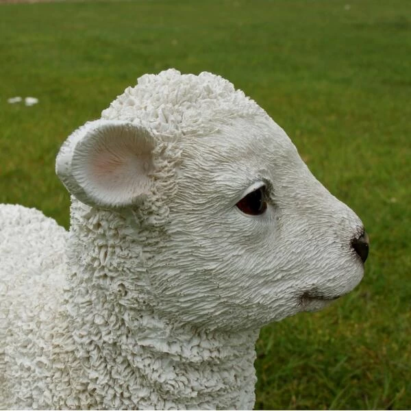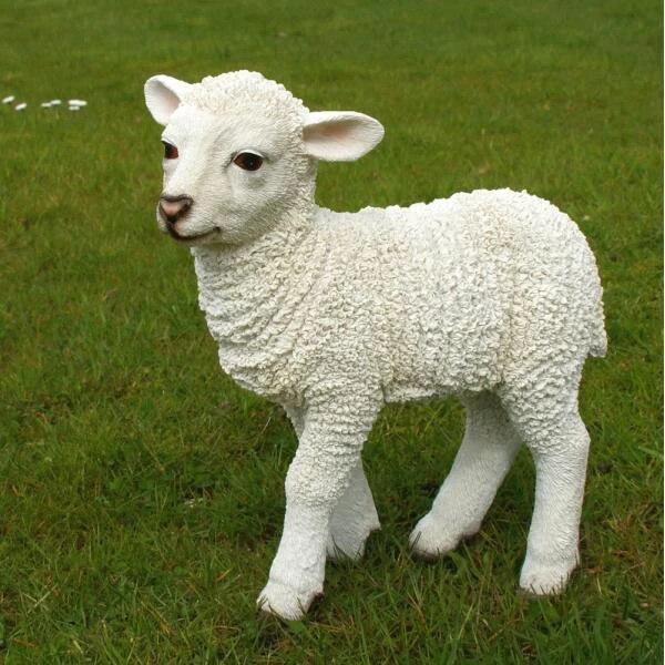 Beeld van een mooi lammetje als tuindecoratie gemaakt uit polyresin.