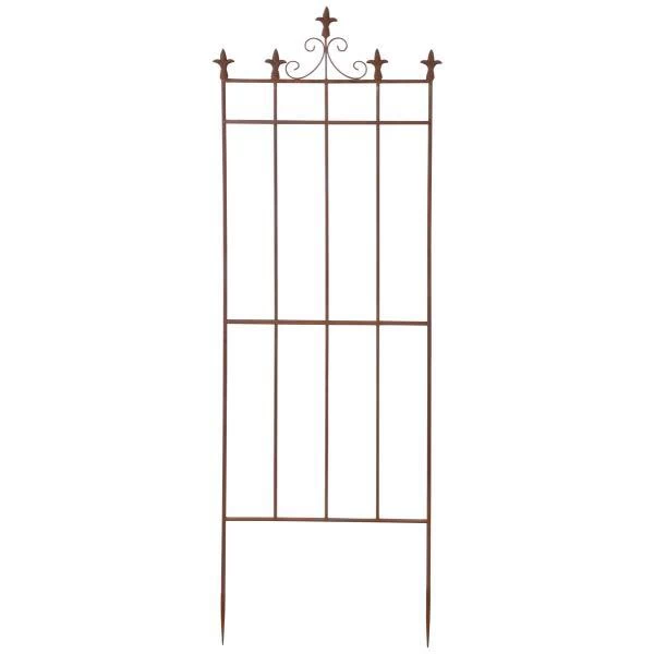 Statig hekwerk en plantensteun versierd met 5 Franse lelies. Het hekwerk heeft een roestige kleur en op die manier een prachtig rustieke uitstraling.