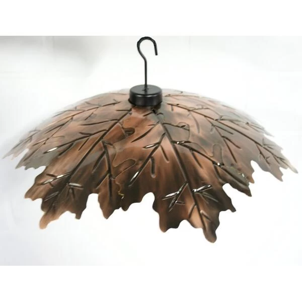 Vogels eten graag op een droge plek, beschut tegen regen, sneeuw en hagel. Dit schild van decoratieve metalen bladeren vormt een paraplu waaronder vogels droog en beschut kunnen eten. De mooie kap wordt geleverd met een sterke dubbele haak waarvan 1 haak bovenaan de kap voor bevestiging aan een tak of touw en 1 haak onder de kap voor de zadenvoedersilo, de pindahouder of het voederelement naar keuze.