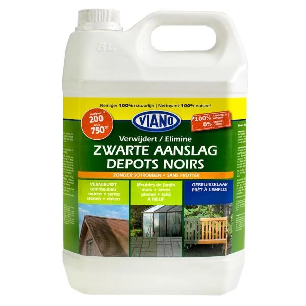 Verwijdert zwarte aanslag op klinkers, terrastegels, omheiningen, tuinmeubels, hout, teak, kunststof, metaal, daken, muren, parasols, zomertenten, glas, enz.